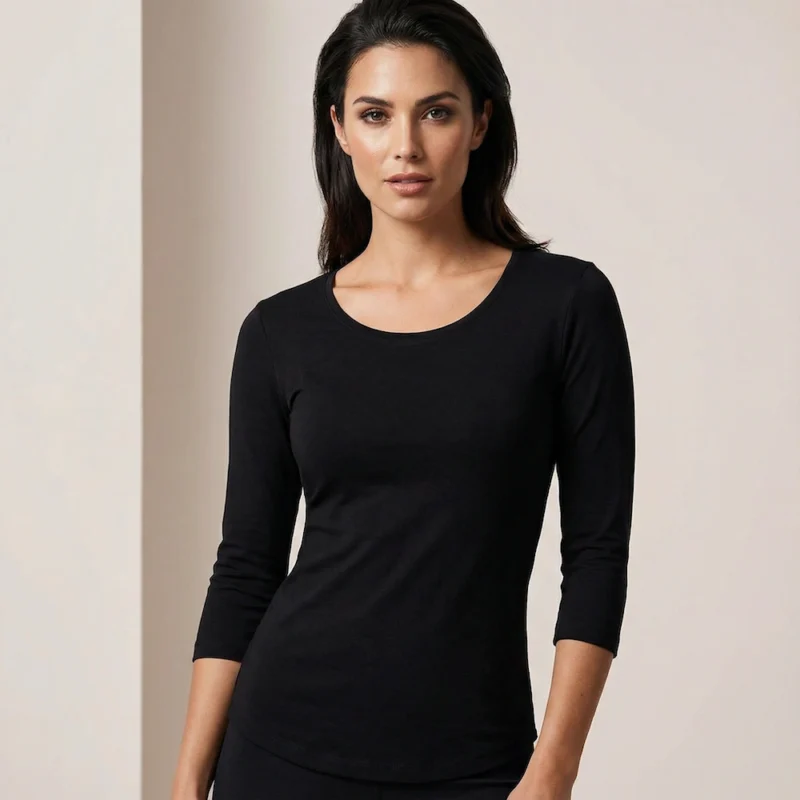 En T-shirt med 3/4 ærmer til kvinder i sort stretch er et must-have i enhver garderobe. Denne alsidige og flatterende beklædningsgenstand er designet til at passe perfekt til forskellige anledninger, uanset om det er til en afslappet dag på kontoret eller en hyggelig aften ude. Den sorte farve og tætsiddende pasform gør den til et tidløst stykke tøj, der nemt kan kombineres med alt fra jeans til nederdele. Fremstillet af 100% kæmmet bomuld, byder denne T-shirt på overlegen blødhed og komfort. Den har også den fordel, at det ekstra stretch sikrer bevægelsesfrihed uden at miste formen, hvilket gør den til det ideelle valg for dem, der leder efter både stil og funktionalitet. T-shirtens rundede halsudskæring og ribkant giver et sofistikeret look, som hæver ethvert outfit, mens de buede kanter tilføjer et moderne præg. Top 3 fordele ved 3/4 ærmet T-shirt til kvinder - sort - stretch: