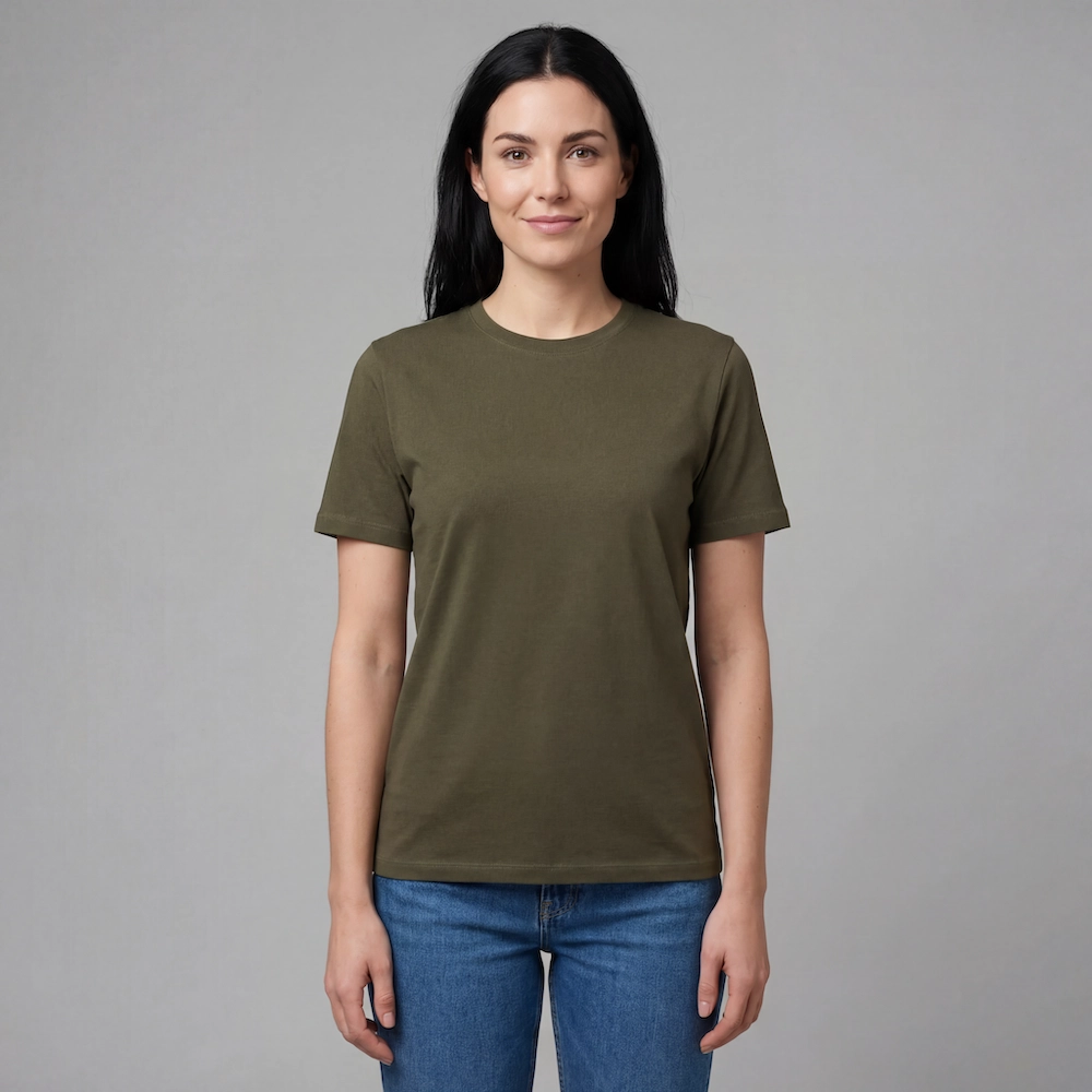 Den regular fit feminine T-shirt i army grøn er en alsidig tilføjelse til enhver garderobe, der kombinerer komfort, holdbarhed og stil. Fremstillet af en kvalitetsblanding af 60% kæmmet bomuld og 40% polyester, tilbyder denne T-shirt en silkeblød fornemmelse mod huden samtidig med uovertruffen holdbarhed.