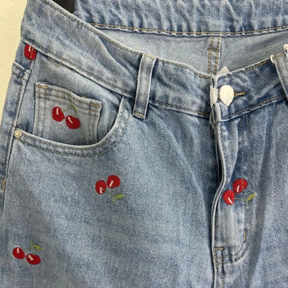 Jeans til kvinder med kirsebær broderet på er blevet en integreret del af moderne modeverden. Disse jeans repræsenterer en unik fusion af stil og komfort, der appellerer til kvinder, som ønsker at tilføje et strejf af friskhed til deres daglige påklædning.