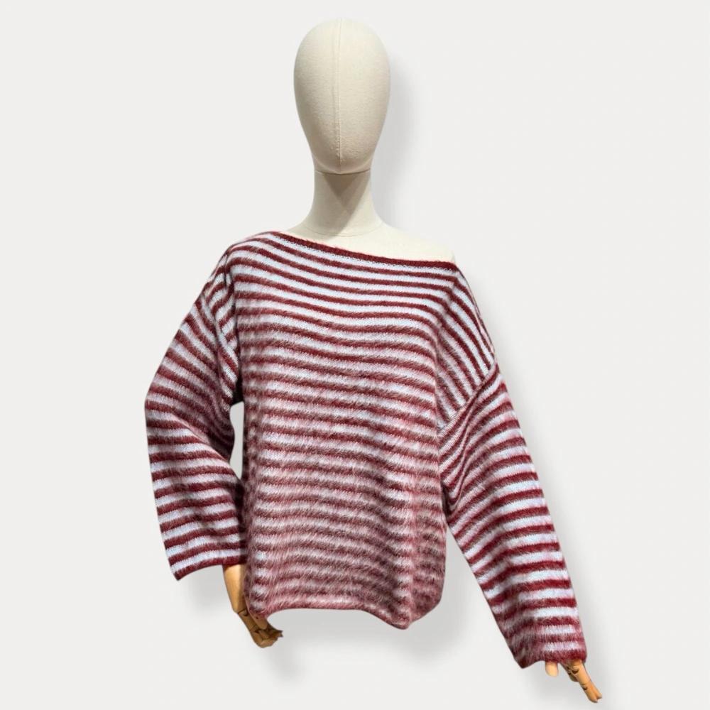 "Vores langærmet off-shoulder stribet striktrøje i bordeaux er den perfekte kombination af stil og komfort, der fuldender enhver garderobe." - T-Shirten.dk