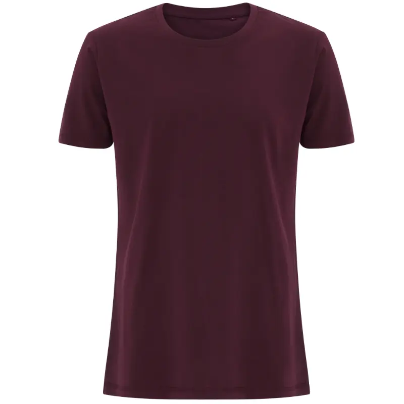 Find svar på de mest almindelige spørgsmål om den økologiske basic t-shirt med rund hals i burgundy til mænd.