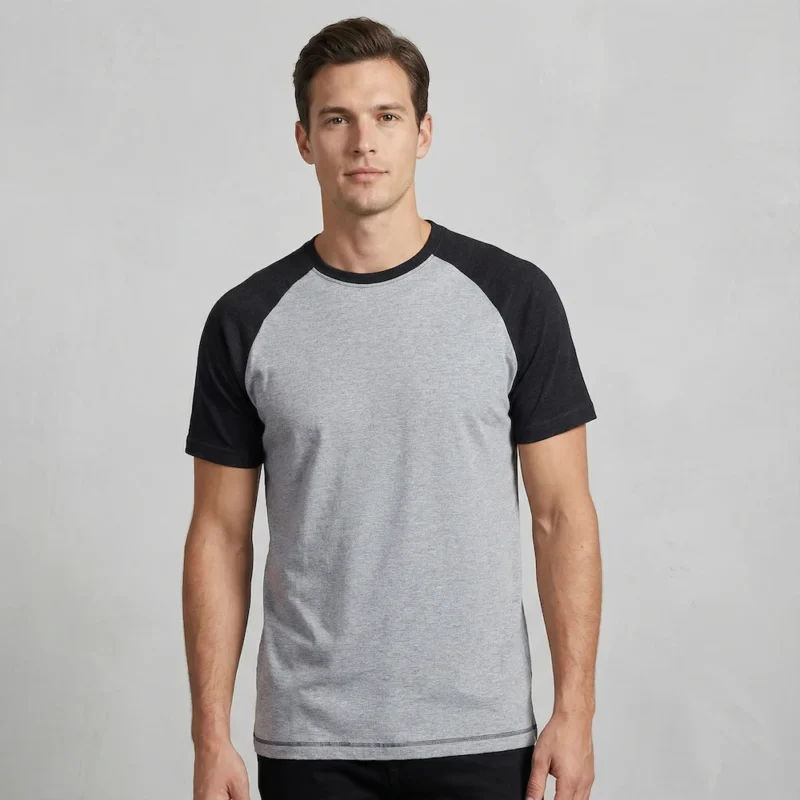"Raglan tee i oxford grey/heather black er det ideelle valg for dem, der ønsker at kombinere stil og komfort i ét produkt." – T-Shirten.dk