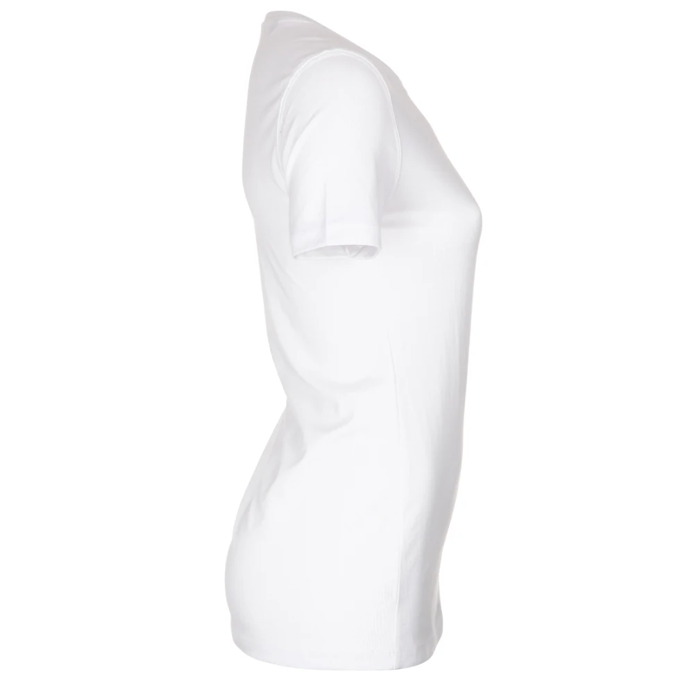 Den hvid formsyet feminin t-shirt i kraftig kvalitet kombinerer tidløs elegance med komfort, og er et uundværligt element i enhver garderobe.