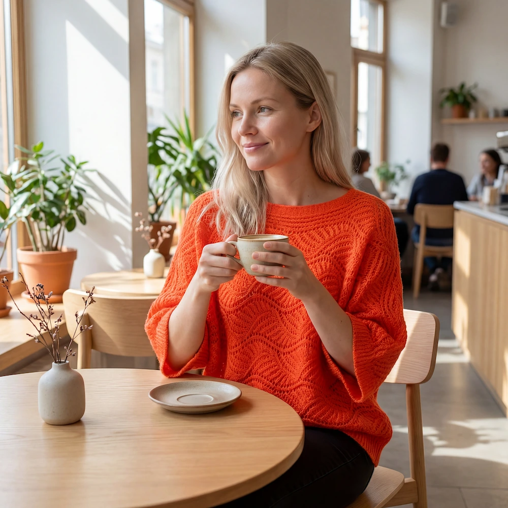 - Strålende orange farve, der bringer liv til hverdagens garderobe